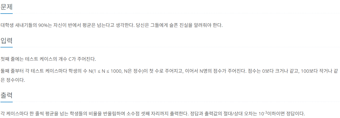 각 케이스마다 한 줄씩 평균을 넘는 학생들의 비율을 반올림하여 소수점 셋째 자리까지 출력한다. 정답과 출력값의 절대/상대 오차는 10-3이하이면 정답이다.